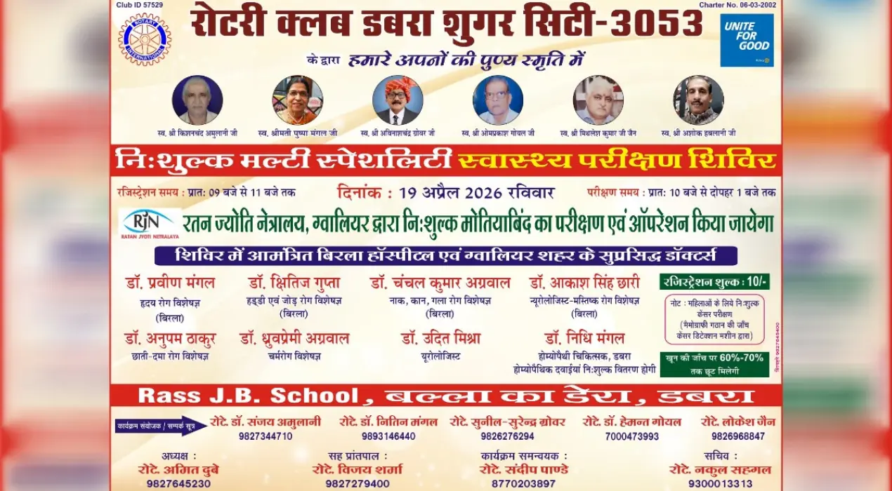 रोटरी क्लब डबरा शुगर सिटी द्वारा 19 अप्रैल को विशाल निःशुल्क मल्टी स्पेशलिटी स्वास्थ्य शिविर