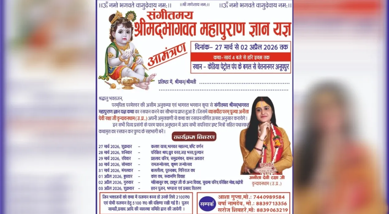 संगीतमय श्रीमद् भागवत महापुराण ज्ञान यज्ञ का भव्य आयोजन 27 मार्च से 2 अप्रैल तक