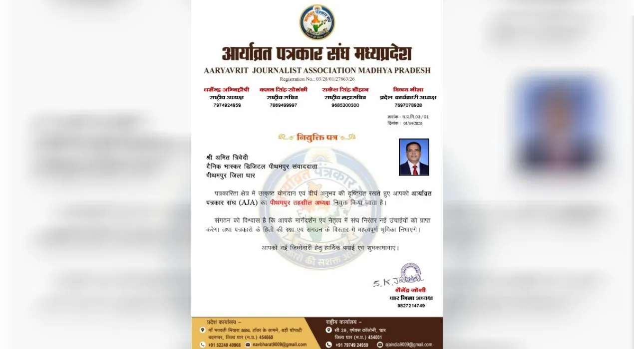 अमित त्रिवेदी पीथमपुर तहसील अध्यक्ष नियुक्त